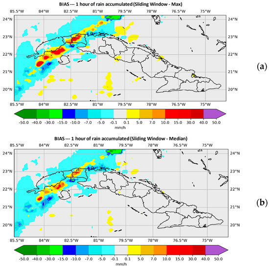Plotted values of the BIAS. (a) shows those provided by the SisPI once the method was applied with the maximum instruction in the forecast period (10–11) with the initialization of the 12:00 UTC and in (b) the ones provided by SisPI with the median instruction and the same initialization, both images refer to the method with a window width N = 3.