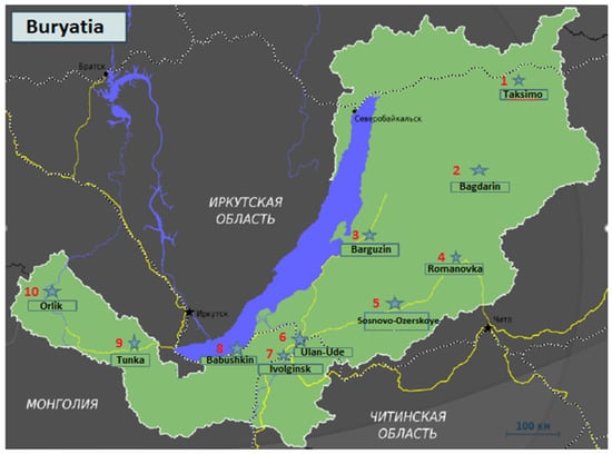 Meteorological stations in Buryatia whose data were used: 1—Taksimo, 2—Bagdarin, 3—Barguzin, 4—Romanovka, 5—Sosnovo-Ozerskoye, 6—Ulan-Ude, 7—Ivolginsk, 8—Babushkin, 9—Tunka, and 10—Orlik.