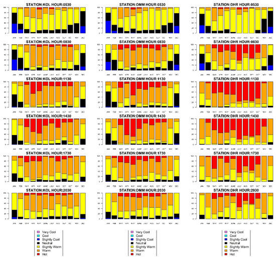 The bioclimate diagram of PET for Alipore (Kolkata), Dum Dum, and Diamond Harbour during the period (2020–2021) at 3 h intervals starting from 05:30 h (IST) till 20:30 h (IST) extracted from the IMD respectively based on Table 1 and is presented in Figure 1. Throughout the observations, PET values suggest that none of the stations experience cool or very cool thermal stresses. Monthly thermal classes of PET vary from slightly cool stress (more than 11.4 °C) to hot stress (more than 43.8 °C) for all three stations. At 14:30 h, a significant percentage of hot stress conditions is observed for Kolkata and Dum Dum from April to May, with a relatively low percentage of hot stress conditions in Diamond Harbour during these months. Out of all the considered stations, the largest share of hot stress conditions (more than 80%) is observed in Diamond Harbour from July to October.