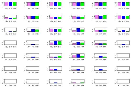 Monthly frequency diagram (in percentages) exhibiting the mean PET for Alipore (KOL), Dum Dum (DMM), and Diamond Harbour (DHR) from the top at 05:30 h, 08:30 h, 11:30 h, 14:30 h, 17:30 h, and 20:30 h from 2020 to 2021.
