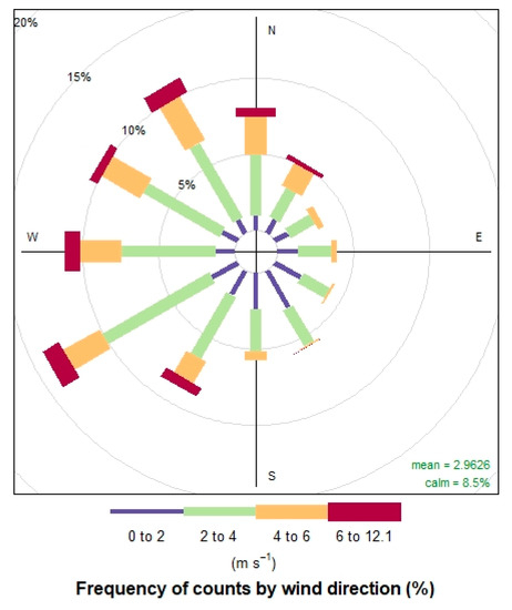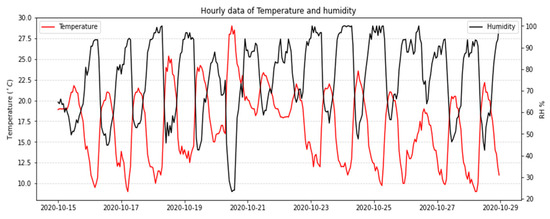Meteorological data, such as temperatures, wind speed, and direction, were collected from the International Meteorology website (http://www.wunderground.com (accessed on 7 March 2022) and from (NOAA Air Resources Laboratory) with processing by R software [7]. Wind rose and hourly change in temperature and humidity in October and November 2020 are illustrated in Figure 2 and Figure 3, respectively.