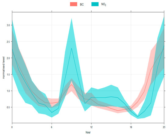 Numerous studies have shown that BC concentration is related to the site type (urban, suburban, rural, downtown) [8,9] and prevailing weather conditions [6,8]. The first method used in this study to apportion the sources of eBC is based on the correlations between eBC and traffic combustion tracer NO2. Figure 4 shows the hourly variation of BC and NO2, and Figure 5 shows their linear regression. A strong relationship between eBC and NO2 was observed during this study (R2 ≈ 0.63), close to the values reported in Malaysian (R2 = 0.71) [10] and English (R2 = 0.88) [1] suburban areas, as shown in Table 1. The ratio between eBC and NO2 is 0.17, equivalent to a value of 0.14 according to the results obtained in Doha, Qatar [2], characterizing diesel fuel. The average eBC values recorded during this study were 1.9 ± 2.2 µg/m3, which are comparable to the values recorded at an urban site in Milan, Italy (1.92 ± 0.88 µg/m3) [11] and during periods of winter biomass burning (1.89 ± 0.5 µg/m3) at residential urban areas in Kwadela, South Africa [12].