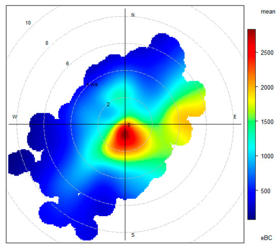 The eBC pollutant rose shown in Figure 6 indicates that the highest levels of eBC concentrations are recorded when the wind speed is low (not exceeding 3 m/s) and comes from the southeast. Daily and hourly pollutant rose diagrams (not shown), show that eBC concentrations peaked at midnight (~23:00 h–00:00 h) when the winds were from the south and southeast.