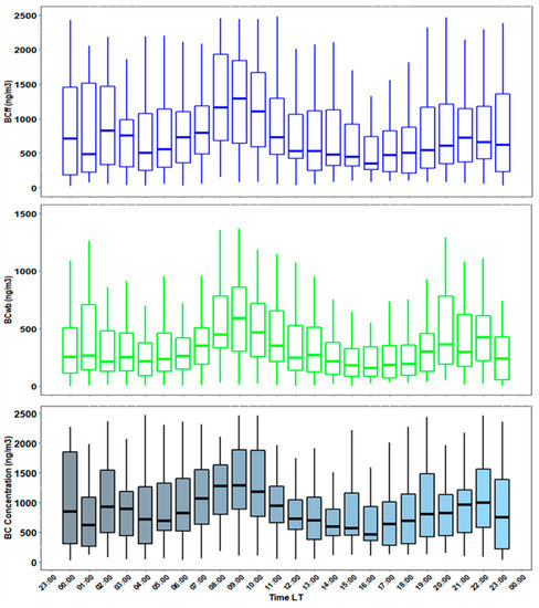 We tracked the evolution of concentrations of the eBC, BCff, and BCwb by studying their hourly changes during the period October 14 to 27 November 2020. The diurnal variations of the mean values are presented in Figure 7. Significant diurnal cycles in eBC and BCwb and BCff concentration were recorded with two peaks, around 8 a.m. and 11 p.m. For non-reactive pollutants like BC, the concentration increases at night when the boundary layer gets shallower than it is throughout the day [1]. Average eBC, BCff, and BCwb values range from 1.9 ± 2.2, 1.6 ± 2.5, and 0.25 ± 0.72 μg/m3, respectively.