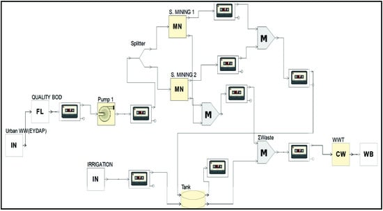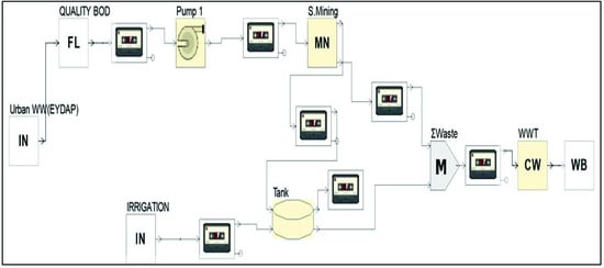 UWOT is a decision support tool that supports the design of the complete (integrated) urban water cycle and helps to achieve sustainable water management for new and existing urban areas [,]. In the context of this study, the Urban Water Optioneering Tool (UWOT) is used to assess the water flows of the Sewer Mining set-up in the Nursery.