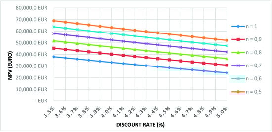 Lastly, an investigation is performed on the effect of economies of scale and learning curves on the investment. Economies of scale is a concept which supports that increasing production units leads to a decrease in overall costs (estimated via a coefficient n). Similarly, applying a learning curve means that each year in the time period examined the performance of the set-up is improved due to experience gained in operating it. The case considered here is the one with two SM Units, for simplification purposes. In Figure 6, the NPV for two SM Units is calculated for different values of coefficient n. The resulting increase in NPV when applying a learning curve as well as economies of scale in a two SM Units scenario is presented in Table 3. The results produced show that implementing these concepts in the economic evaluation can drastically improve the estimated gains for this technology.