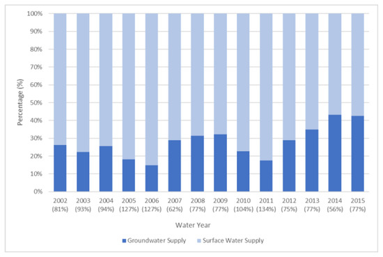 Contribution of surface and groundwater to the total water supply. In the horizontal axis the numbers in brackets represent percentages of normal precipitation (average of the annual precipitation values) from 1981 to 2010.