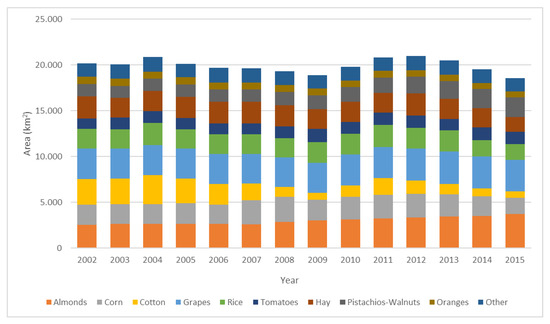 The agricultural sector of California is by far the most profitable in the United States, with revenues up to 50 billion dollars in 2017 [25]. On account of the large variety of the state’s agricultural products (more than 400 different crop types), in the current analysis, a manageable number of them was selected by taking into account the following criteria: (a) the economical profit that these products provided from 2009–2015; (b) their exports from 2011–2015. The time periods that we chose were not random, rather, they were mandatory because of the lack of data for the previous years. The planted area of the selected crops between 2002 and 2015 is represented in Figure 2. It should be noted that livestock products were not considered. Dairy products and the areas cultivated for animal grazing, except for alfalfa and some other types of hay, were, also, excluded from the analysis.