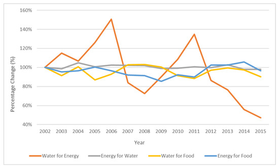 In Figure 4, the percentage change of the water–energy, energy–water, water–food and energy–food flows considering 2002 as the baseline year is depicted. According to Figure 4, the water–energy flow presented several extremes, which are explained by the close interrelation of this flow with annual precipitation and snowfall levels (water availability), possible extreme natural phenomena etc. The declining trend in this specific flow was caused by the reduced power generation of the large hydroelectric stations after 2011. The production of hydroelectric facilities reduced because of the severe drought that started in California in 2012 [41] and was accompanied with very high temperatures and, therefore, high evaporative losses from the state’s reservoirs. Conversely, the irrigation water supply (water–food flow) remained relatively stable. The groundwater reserves made a significant contribution to this, which, as usual in water years with low precipitation, ensured the provision of a large part of the required, valuable resource, so that California could cover its water demands. The energy–water flow remained in stable levels, because of the ability of the energy mix to recover the inefficiency of hydroelectric stations with the supplementary production of the natural gas-fired facilities. The application of chemicals and energy inputs to agriculture (energy–food flow) also did not present serious fluctuations.