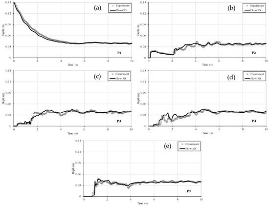 Water depth comparison at the locations P1–P5. (a) P1, (b) P2, (c) P3, (d) P4, (e) P5.