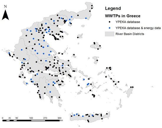 An important and crucial part of this survey was to collect, process and integrate all necessary data, relevant to the current energy status of existing WWTPs, in a database. Actual focus was given during their collection phase to utilize available national or international data sources. The main sources used were the Greek Wastewater Treatment Plants Database [18] as well as the European Database of WWTPs [19] on the implementation of Directive 91/271/EEC. The results of the data collection phase for WWTPs across Greece were integrated into a database, with the reference period 2016–2017. In total, we managed to collect operational and technical specifications data for all the 243 licensed WWTPs, while energy profile data per treatment stage were managed to be collected for a sample of 61 WWTPs as shown in Figure 1. The main data collected from the 61 WWTPs were: list of main electromechanical equipment in use, energy consumption and energy cost data where available. The whole database represents all reported facilities in the Greek national registry with a total capacity of almost 14 million population equivalent (P.E), while 25% of the facilities have tertiary treatment available. This represents more the 50% of the nation’s P.E. capacity. Influent volumes rise to 836,000 m3 while the total dry sludge (DS) production is about 92,000 tons/year. Based on the present 302 million m3 of treated effluent, only 8% of it is currently reused: mainly in the River Βasin District (RBD) of Crete (2.5 million m3 per year) and Western, Central and Eastern Macedonia RBDs (1.7 million m3 per year). Regarding the sample of 61 WWTPs with energy profile data, they represent 4.5 million P.E (32% of the population), 15 of which (25%) have tertiary treatment technology. The anaerobic digestion process is already applied in a small subset (12 facilities—20%) of them.