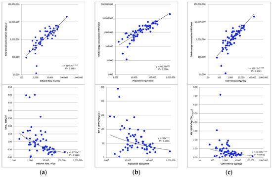 Total energy consumption and key performance indicators (KPIs) based on effluent inflow (a), population equivalent (b) and organic load removal (c).