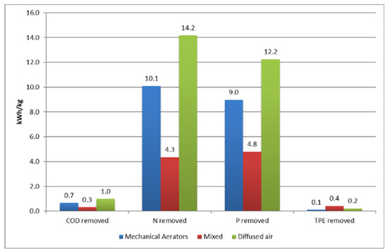 Among the parameters studied in this survey was the aeration system. Higher values of specific energy consumption for organic load removal were found in diffused air than in mechanical aeration (Figure 4). The diffused air method is mainly used in smaller plants, which are less energy-efficient as mentioned above.