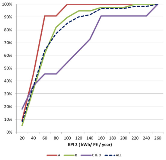 Further analysis of the distribution of KPI values among different capacity classes reveals the variance and total extent differences among them as shown in Figure 3. In all cases, it is confirmed once more that the largest WWTPs (Class A and B) are the most efficient both operationally and in terms of energy efficiency. The largest variance is met in small WWTPs (C and D classes) for KPI 1 and KPI 2.