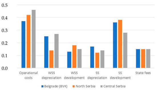 The average EP for WSS for the depreciation part (approx. 0.2 €/m3) is slightly higher than the development part of EP (approx. 0.15 €/m3), while for the SS it is quite the opposite (approx. 0.15 €/m3 for the depreciation part and approx. 0.35 €/m3 for the development part). It is logical and also a consequence of the percentage makeup of these systems—Table 1 (WSS 85%, SS 55%) and especially due to the low number of built wastewater treatment plants. It should be said that the WSS depreciation is higher in central Serbia primarily due to the existence of dams in some WSS (Aranđelovac, Zaječar, Užice and Čajetina from the list).