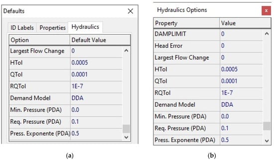 Properties editor for convergence related parameters and pressure-driven (PDA) parameters: (a) Project defaults settings; (b) Hydraulics Options.