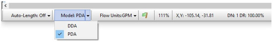 The demand model can be selected in the properties editor for the Hydraulics Options or in the Status Bar. The Status Bar also allows the change of the flow units and reports the number of pressure deficient nodes (DN) and their percentage of demand reduction (DR)—see Figure 2.