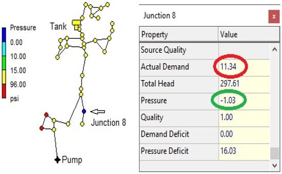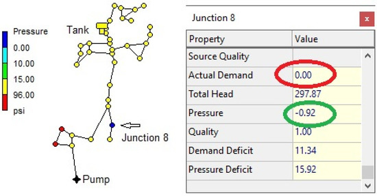 PDA: junction 8 had a negative pressure (−0.92 psi) and no demand was delivered.