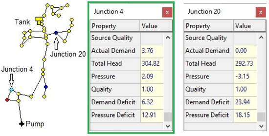 PDA: junctions 8 and 20 had negative pressures, while although junction 4 had a positive pressure, it was not enough to fully satisfy the required demand.