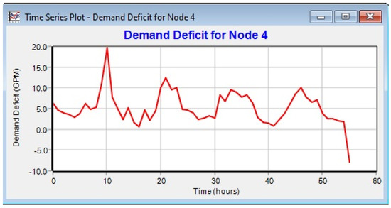 Analyzing the program output, junction 8 still showed a negative pressure, but then, no demand was delivered. There existed a pressure deficit of 15.92 psi and a demand deficit of 11.34 GPM, which corresponded to a demand reduction of 100%—see Figure 5.