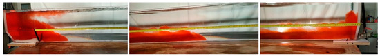 Experiments began with the removal of the vertical partition. The gravity current is generated, due to the horizontal density gradient, after the removal of the partition. The heavier fluid propagates towards the lighter fluid reservoir along the bottom of the tank and the lighter fluid propagates along the free surface in the opposite direction. For flow visualization, the saltwater was dyed with rhodamin (red color). Series of images were captured using a camera mounted on a stationary tripod in front of the tank after the initiation of the current. These recordings were subsequently analyzed to determine the front position and velocity as functions of time, by measuring the time required for the front to travel fixed-length intervals marked on the tank. A digital camera was used for the viewing of current and then measured the height and the position of the current front (Figure 2).