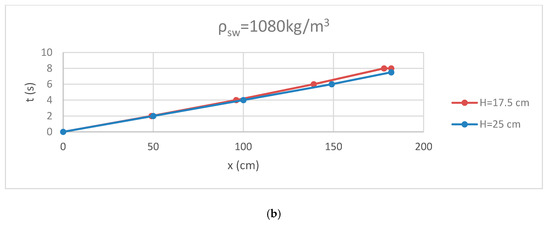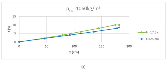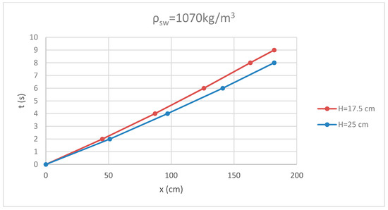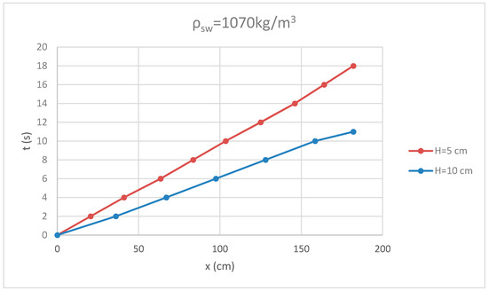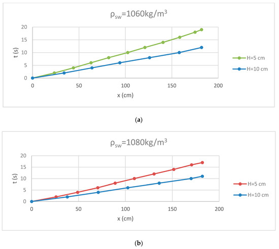In Figure 3 and Figure 4, the effect of depth H on the motion of the gravity current is examined for the same density (ρsw = 1070 kg/m3) for both cases (trapezoidal and composite section). As it is observed, the gravity current with the greater depth H travels faster in all cases.