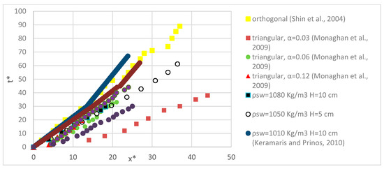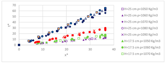 In Figure 7 the dimensionless distance x* is plotted against the dimensionless time t* from the opening of the gate for gravity currents for all cases (all depths and all densities). The distance x is made dimensionless with the water depth H and the time t from the lock exchange with the parameter (). It is obvious from this figure that the currents with the greatest density and the greater depth H move faster.