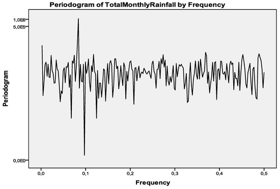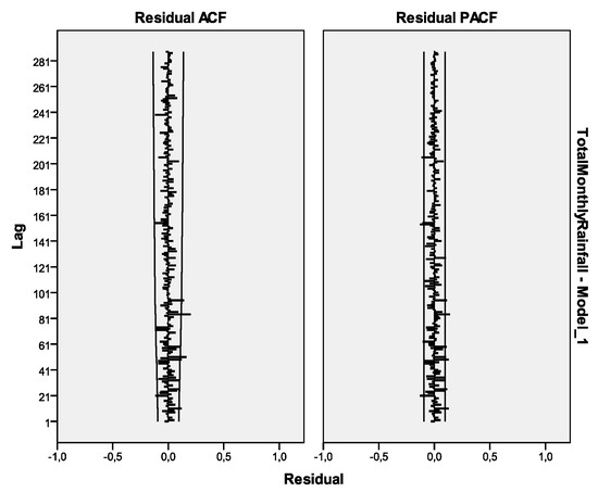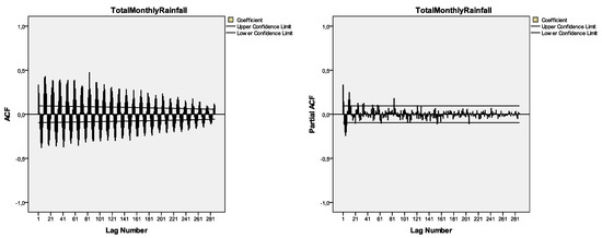 Visually inspecting, an anticipated conventional six-month seasonal pattern, following a cyclical pattern between the summer period during which the recorded rainfall levels are very low or zero and the winter period during which the rainfall reaches its highest levels, cannot be definitely either traced or recognized. Furthermore it should be noted that the performance of the time series analysis in the spectral domain, and after having examined the spectral density graph, proving that the largest seasonal pattern takes place at approximately 12 months’ time intervals, instead of six-month intervals [8]. Hence, we conclude that, by charting the ACF plot, the seasonality pattern unfolds, which could not be discovered by the simple linear equation describing the linear trend line associated with the original raw total monthly recorded rainfall data. This pattern can be easily identified in Figure 4 (left chart), focusing on the high peak at close a period of 12 months.