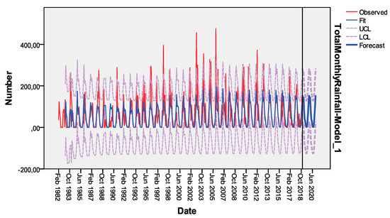 Forecasted total monthly rainfall values of SARIMA [(0,0,0) × (0,1,1)12] model of Karyes village district, Chios Island, Northeastern Aegean Sea, Central-Eastern Greece.