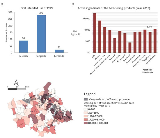 Analysis of the active ingredients class of use (bar-graphs (a,b)) and map reporting the spatial distribution of the PPPs sales.