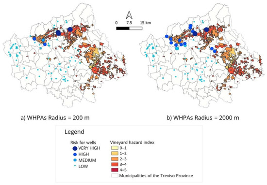To understand if any changes occurred along the investigate time period 2012–2019, the harmfulness of the vine-specific PPPs distributed in the years 2013, 2016, and 2019, together with the extension wine-growing areas (CLC2018), were used to realize the hazard maps reported in Figure 3. The hazard level is indicated with colors ranging from yellow, for null or low hazard areas, to dark red, for very-high hazard areas. In 2016 the majority of wine-growing areas were characterized by a high hazard level while in 2019 areas with medium and high hazard levels were equally distributed. In 2013 the overall hazard level of the vineyards was in the middle of the other two. However, since the complete national regulation on the PPPs sales registration was available to the regions in 2014 only, missing PPPs sales data in years 2012 and 2013 limit the reliability of the hazard map developed for this latter. Considering the sales data collected along the entire period 2012–2019, although the quantity of PPPs sold in the province is increasing, the total hazard, on average, is decreasing. This result can be linked to the gradual changeover of many winemakers to the more profitable and advertised biological market. From 2013 to 2016, the biological cultivated hectares increased from 11,741 to 18,549 hectares in the Veneto region (http://dati.istat.it/index.aspx?queryid=31926, accessed on 18 October 2022). The information obtained from the 2019 hazard map was used to develop the vulnerability maps reported in Figure 4. The map (a) shows that, already by considering inadequate WHPAs [14], defined as circular areas around the wells having a 200 m radius, four wells have a very high vulnerability, six wells have a high vulnerability, one well has a medium vulnerability, and all of them are located in the DOCG area. This result supports quite well the problem statement presented at the beginning of this work, being the area for the Prosecco production an example of highly exploited agricultural territory that is also strategic for the extraction of drinking water for human consumption. The remaining wells distributed within the Treviso province present a low vulnerability. The choice among very high, high, medium, and low vulnerability, depends on the WHPA surface interested by PPPs and on the level of hazard related to them. As previously explained, due to difficulties to obtain WPHAs’ extensions by isochrone criterion, a second vulnerability map was developed assuming a geometric criterion but increasing the radius up to 2 km. In other words, we realized a trick to account for both elongated shapes of the WHPAs—related to specific subsurface hydrogeological conditions—and spreading phenomena (e.g., wind drift) that affect the application of the plants’ treatments. In this scenario, 23 wells classified as low vulnerability, present now a medium or high vulnerability (Figure 4b). This means that, by properly defining the WHPAs—approximately in between the two considered scenarios—the vulnerability map can provide a prioritization of the wells and of the PPPs-specific actions required to minimize the risk for drinking water supplied for human consumption.