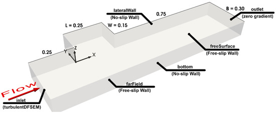 The rigid-lid approximation was applied at the free surface of the domain (z = 0.10 m), which is valid for subcritical flows within Fr < 0.36 [24]. The free-slip wall condition was used at y = 0.30 m. The width of the main channel covered by the numerical model was only 0.30 m (the full width of the experimental main channel was 0.85 m), because, at this location, the effect caused by the cavity in the main channel is negligible [25]. The inlet was calculated in two phases: (a) precalculated velocity fields that were fully developed in a periodic channel, under the same flow conditions and the same main channel geometry; and (b) the average incoming flow was used to generate turbulent fluctuations using the turbulence divergence-free synthetic Eddy method [26]. A convective outflow boundary condition was adopted at the outlet, in which the zero-gradient condition allows the flow to exit the domain without having any backflow. The bottom of the domain, the walls of the main channel, and the cavity were considered no-slip walls. The turbulent viscosity was modelled in all of the no-slip walls of the domain with the Spalding wall function.