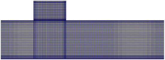 The computational points in the entire domain were displaced in a rectangular grid, composed of hexahedral elements. The main channel was divided into a grid of 120 × 120 × 40, for the streamwise (x-axis), spanwise (y-axis), and vertical directions (z-axis), respectively, while the cavity was divided into 80 × 80 × 40. Figure 2 shows the computational grid in the free-surface plane. The total number of hexahedral elements was 1,408,000 elements and a maximum y+ = 6.8 and z+ = 2.2. The discretization of the domain was defined with the grid uncertainty evaluation proposed by [28]. Three grids were employed in which the calculated uncertainty was 1.74% in the medium grid, which was chosen for the next simulations. The model was decomposed and solved on 48 cores each (Intel Xeon E5-2670v3 (Haswell) with clock frequencies of 2.3 GHz) and took an average of ≈18 h to simulate 100 s of flow.