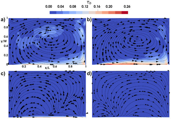 Figure 3 shows the contours of bed shear stress and the flow streamlines at z/H = 0.2 (z = 20Φ for very coarse sand, see Table 2). For a < 0.13%, a main anti-clockwise motion was formed (Figure 3a,b). For a > 3.99%, the main circulation started to develop a secondary circulation at x/L ≈ 0.8 and y/W ≈ 0.2 and the main circulation’s centre was translated to x/L ≈ 0.2 (Figure 3c). The further increase in density increased the size of the right circulation and started to suppress the left one (Figure 3d). Both circulations had contact with the main channel. Unlike the pattern for non-vegetated lateral cavities [29], the flow entered from the most upstream (x/L ≈ 0.3) part of the cavity and exited through the downstream (right portion) for a ≥ 3.99% (Figure 3c,d).