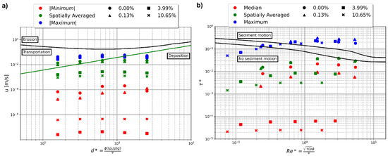 Sediment motion was analysed with Hjulström and Shields curves. Concerning the Hjulström curve, Figure 5a shows that, in the zones with high velocity (e.g., downstream wall of the cavity), and for sediments with Φ < 0.00025 m, transport can occur. For low and average velocities, sediment was deposited. In relation to the Shields curve in Figure 5b, sediment movement also only occurred in regions with high velocity and when the granulometry was larger than very fine. The increase in vegetation density reduced the bed shear stress, which secures that the “no sediment motion” status continued for denser vegetations. Thus, the increase in vegetation density tends to preserve trapped sediments inside the region. Furthermore, vegetation impacted sediment transport at different rates. In both diagrams in Figure 5, the maximum values of u and were not largely influenced by the increase in vegetation density. Nevertheless, the enhancement in vegetation density impacted the spatial average and minimum values of u and . Moreover, at the minimum series of the Hjulström diagram (Figure 5a), the velocity, for a = 3.99%, was higher than the higher densities (a = 10.65%), which did not occur for the shear stresses in the Shields diagram (Figure 5b). This behaviour indicates that a threshold not only occurs for the velocity, but also for sediment transport.