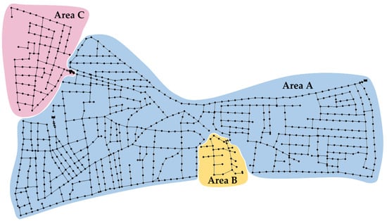 L-Town is a benchmark WDN of a small hypothetical town, modelled in EPANET. The system is supplied by two sources, namely reservoirs R1 and R2, and distributes water to approximately 10,000 people through a pipe network of 42.6 km. The consumers’ profiles include residential, commercial, and industrial uses, resulting in a typical distribution during the weekdays and higher consumption during nighttime for the weekend for areas with residential and commercial uses. The system is divided into three supply areas, as shown in Figure 1, with area “C” characterized by the highest elevation and area “B” by the lowest.