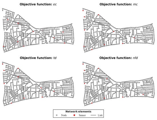 It was assumed that all junctions were suitable for placement (i.e., it is technically feasible to place a sensor) and the sensors were perfect (i.e., measurements were totally accurate and there was no minimum detection threshold). The junctions on which sensors were optimally placed, according to each objective function selected, are presented in Table 1 and visualized in Figure 2.