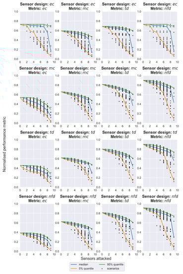 The performance indicators for each scenario, grouped by sensor design, are utilized in a special type of graph, the resilience profile graph [20,21]. On the original methodology, on the x-axis, the stress scenarios are described in increasing order (i.e., the number of sensors attacked), while the y-axis describes performance. The area under the performance curve, scaled from 0 to 1, is the resilience of the system. For scenarios that can have many realizations (as in this case, where the scenario “2 sensors attacked” consists of many possible pairs), the methodology was modified to account for uncertainty in the work of Nikolopoulos et al. [22] by describing the resilience of the performance quantiles curves (e.g., resilience under the worst 5% realizations of the various scenario types). Because this case study explored four different resilience scores for each sensor design, the need for a multi-metric resilience analysis arises. We used a weighted resilience metric (WR) with equal weights of 0.25 for each resilience score for the performance metrics ec, mc, td, nfd, in order to compare the sensor designs, under increasingly stressful failure conditions imposed by the cyber-physical attack scenarios. Finally, the weighted nominal performance (WNP) indicator was calculated to describe the performance for the nominal operating conditions for the special scenario of 0 cyber-attacks (i.e., all water quality sensors are operational). The mean ec, mc, td, and nfd performance of that scenario were given equal weights of 0.25.