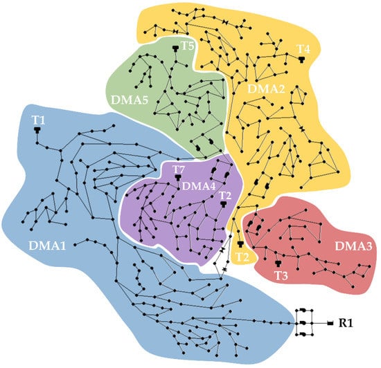 C-town is an EPANET demo WDN, based on a medium-sized real world network []. It is comprised of seven tanks, and five pumping stations with a total of 11 head pumps, which are used to store and regulate the water distribution to 388 consumption nodes. The WDN is supplied by a single source, the R1 seasonal reservoir, with an average hourly production of approximately 613.17 m3/h. The system is divided into five district metered areas (DMA), all of which include a pumping station and at least one tank in them, as illustrated in Figure 1. The fundamental C-Town operation mode draws water from R1 through the linked pumping station, according to the level of tank T1. In high water levels, only one pump draws water, and a second pump is activated for critically low levels. The pumping station also has a third, redundant pump placed in parallel. The flow from DMA1 to DMA2 is regulated with the use of two flow control valves that operate according to the T2 tank level, while two pressure regulating valves (PRV) are placed within DMA2. Water from T2 is pumped to the higher tanks, namely T3 and T4. The pumping stations of DMA4 and DMA5 pump water to tanks T5, T6 and T7 from DMA1 and T1. The pumping stations activation rules are based on the level sensors of their DMA tanks.