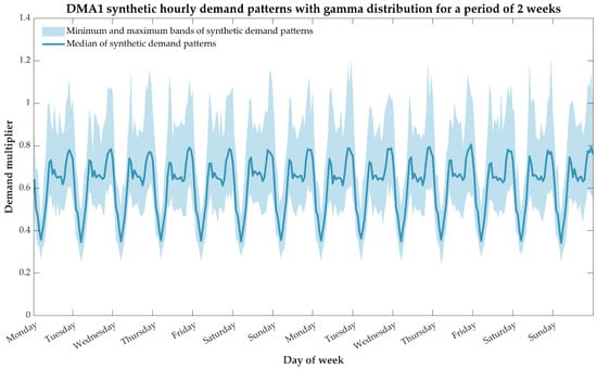 Median and outer bands (minimum and maximum) of the synthetic hourly demand pattern timeseries with gamma distribution generated for DMA1.
