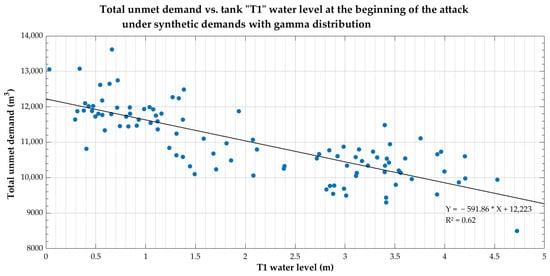 Relationship between the water level in tank “T1” when the cyber-physical attack starts and the resulting total unmet demand, simulated using synthetic hourly demand patterns with a gamma distribution.