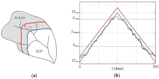 Schematic representation of the model concept: as a function of the freezing elevation ZT(t) on the day t, the relevant contour line delimitates the contributing area Ac(t) on the same day (a). In (b), the blue line represents the freezing elevation annual regime. In both panels, the red line exemplifies the result of a temperature increase.