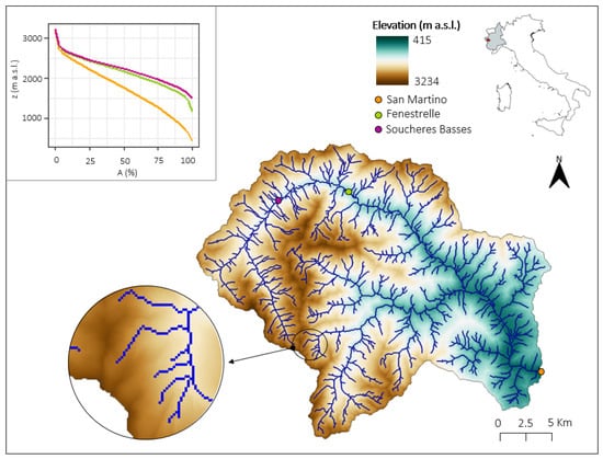 River network of the Chisone basin having its outlet in San Martino (orange dot). Two other gauged sections within the basin, Fenestrelle and Soucheres Basses, are indicated with a green and a purple dot, respectively. The top left graph shows the hypsographic curves of the three basins with normalized areas on the x-axis.