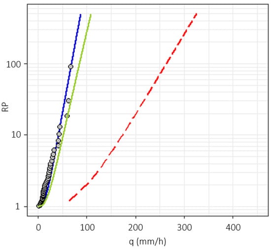 where RP is the return period of a flood discharge corresponding to the undisturbed q100 under current climatic conditions (blue curve in Figure 3) while RP’ is the return period of the same discharge under modified climatic conditions (green curve in Figure 3).