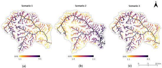 Variability of the RPR index along the stream network under the hypothesis of ΔZT = 400 m (a), Δα = 10% (b), or ΔZT = 400 m and Δα = 10% (c). Gray points show RPR higher than 4.5 for the first scenario and higher than 8.5 for the third scenario. This occurs in sub-basins having very high minimum elevations.