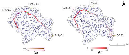 As previously mentioned, we also assessed the link between the RPR index and some basin morphological features, e.g., the ζ parameter. The ζ parameter controls the distribution of areas at different basin elevations, thus representing an important indicator of how much a basin may be affected by significant vertical variations in the position of the snowline. A map describing the variability of ζ along the river network is compared to the map of RPR3 in Figure 5. A rather close relationship between the RPR values and the ζ parameter over the main channel is apparent; the two quantities seem to vary inversely, except for in the last reach of the main channel.