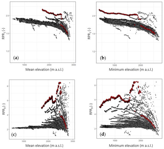 Figure 6 shows the relationship between the RPR values and the mean (Figure 6a,c) and minimum (Figure 6b,d) elevation of the sub-basins for the first (Figure 6a,b) and third (Figure 6c,d) climate change scenarios. Red points represent the main channel.