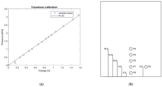 Calibration curve of a single transducer (a). Localization of the transducers on the downstream wall, the unit of measure is cm (b).