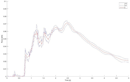 Time history of the force extents on the wall, μ is the arithmetic mean, and σ is the RMS of the force extent on the wall for the set of ten experiments.