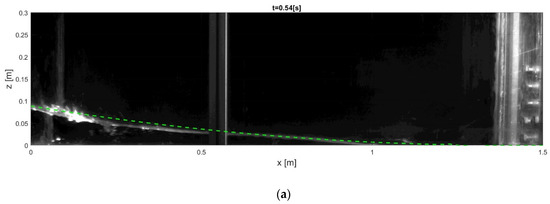 No other sensors were needed to obtain the celerity of the propagated front and the water surface. In fact, with this image processing technique, it is possible, if the image is georeferenced, i.e., calculating the pixel–centimeter ratio of the images, to create a water profile. Moreover, knowing the time gap between two consecutive frames, the front celerity can be obtained.